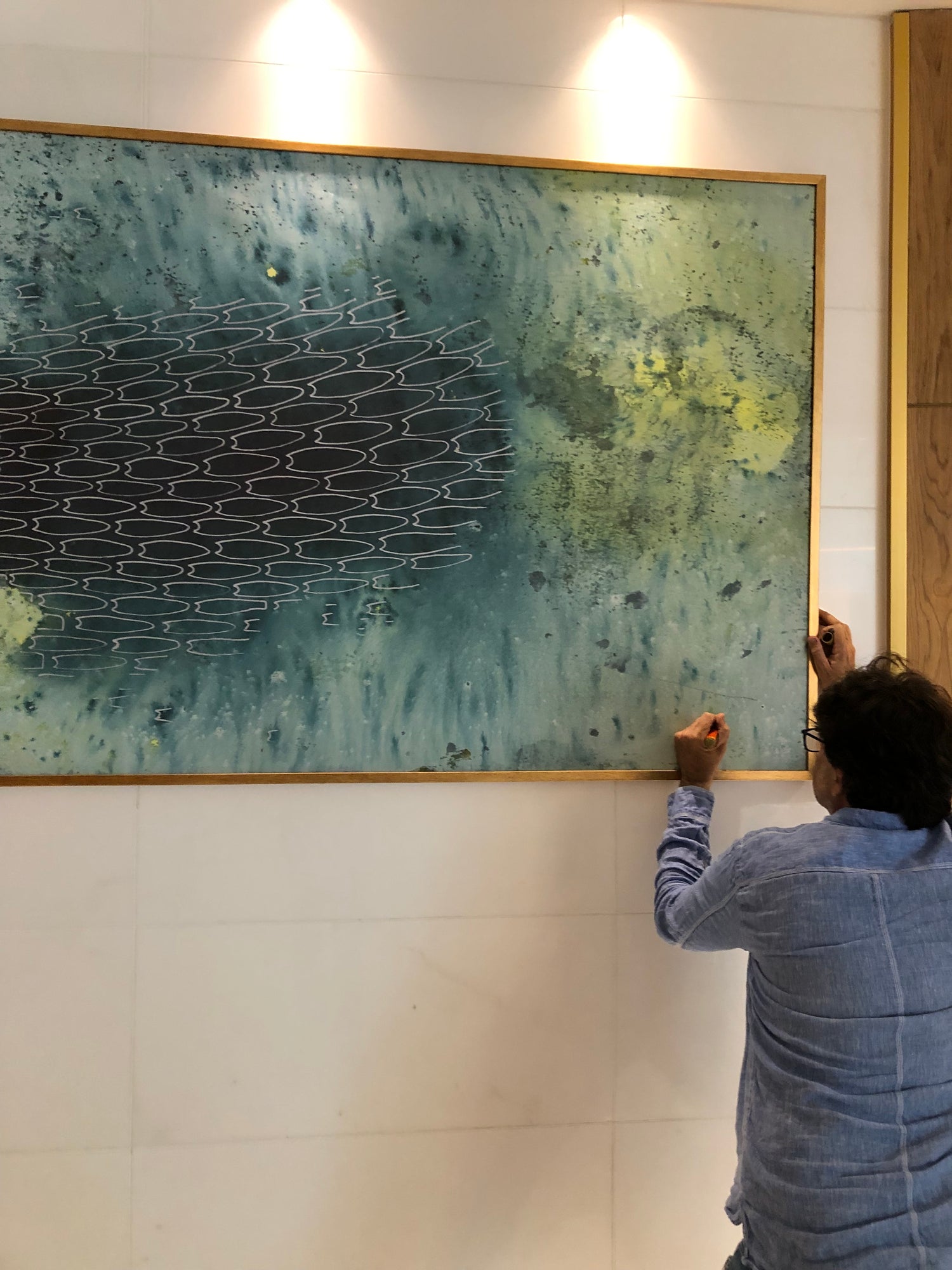 The work was done together with the architect and hotel developer, creating a clean and balanced integration of art within the space.